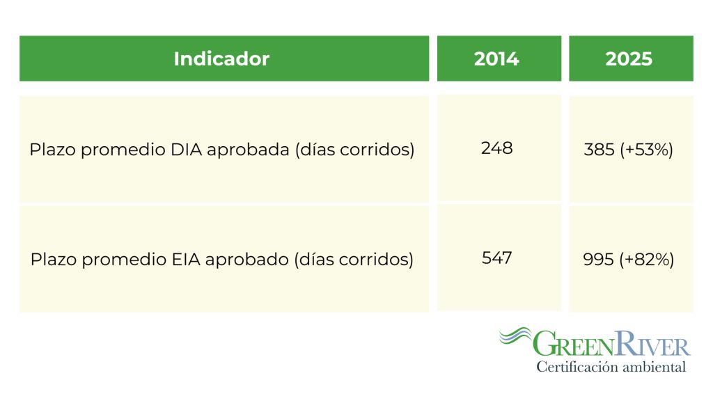 Los plazos reales de evaluación ambiental en Chile llevan una década de crecimiento sostenido. El SEA cumple los plazos legales (el diseño normativo incluye silencio administrativo positivo como resguardo), pero los tiempos totales de tramitación incorporan suspensiones solicitadas por los titulares, procesos de participación ciudadana y consultas indígenas, entre otros factores.